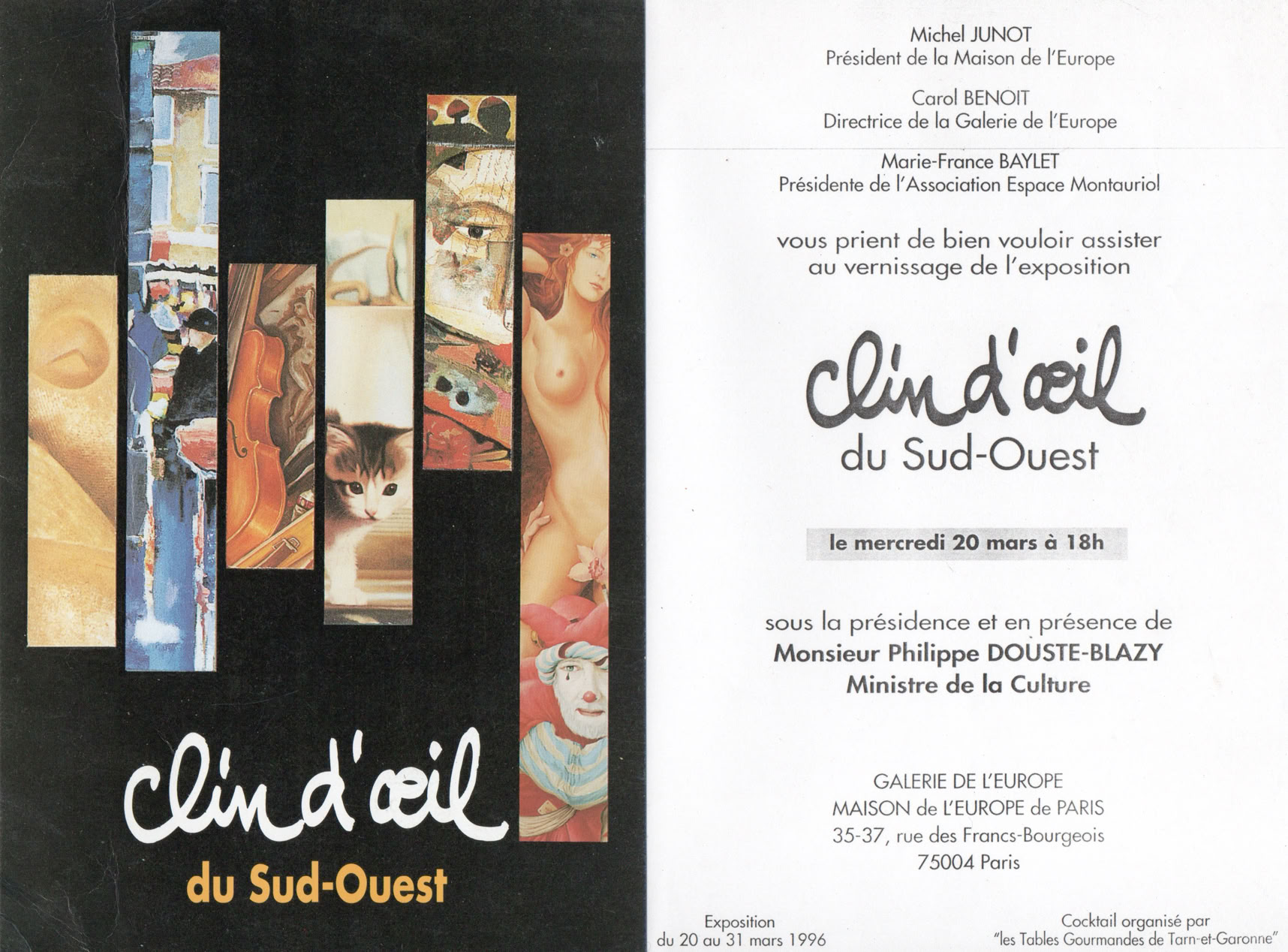 "Avec un clin d'oeil de défi, après Ingres et Bourdelle, les Artistes de Tarn-et-Garonne nous offrent, à leur manière, d'intégrer l'art à la vie. Quelle que soit leur orientation personnelle il faut insister sur la richesse respective de leur talent, reflet de notre monde inépuisable. En accueillant ce "Clin d'oeil du Sud-Ouest", la Maison de l'Europe rend un bel hommage à l'Europe des artistes et l'Europe des Régions."