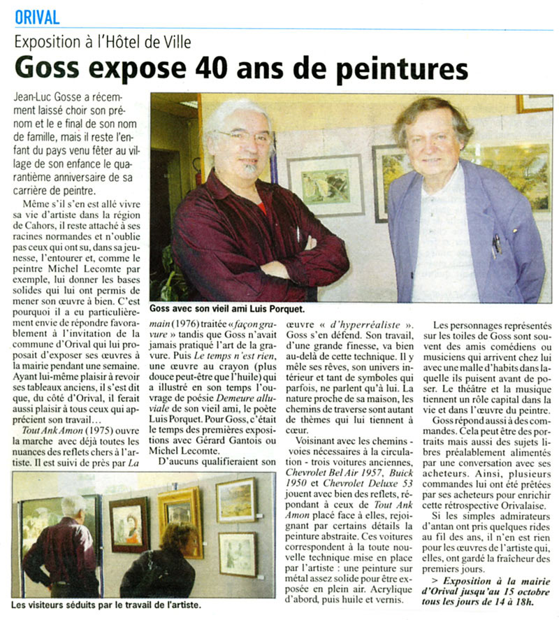 Lors du vernissage, les nombreux amateurs d'arts, mais aussi des peintres comme lui, ont pu faire connaissance avec cet artiste qui se met facilement à la portée de tous. Jacqueline Meunier, co-présidente de l'Avica, a tenu à remercier et à féliciter l'homme du jour pour la beauté de son exposition. Quant à Goss, il ne put laisser sous silence «combien il était agréable d'exposer dans cet Espace République».