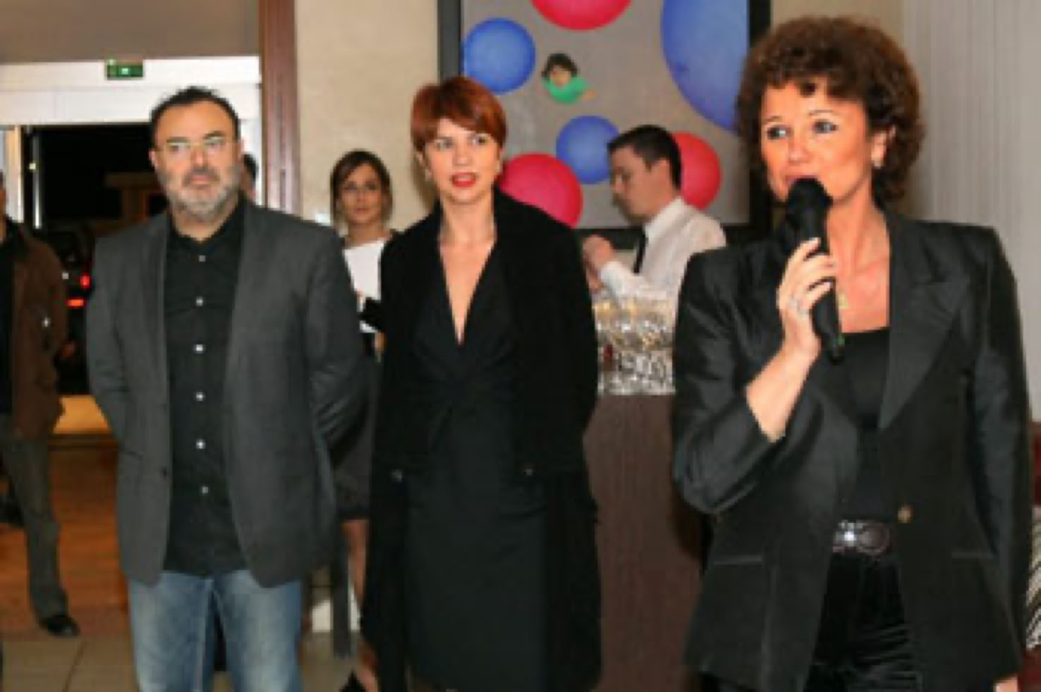A l'occasion du vernissage de la septième exposition des Artistes d'Atout Cœur présidée par Marie-France Baylet, M. Goss, commissaire général d'exposition, accompagné de M.Christian Delmotte, directeur du Crown Plaza, présente les trois artistes Midi-pyrénéens :