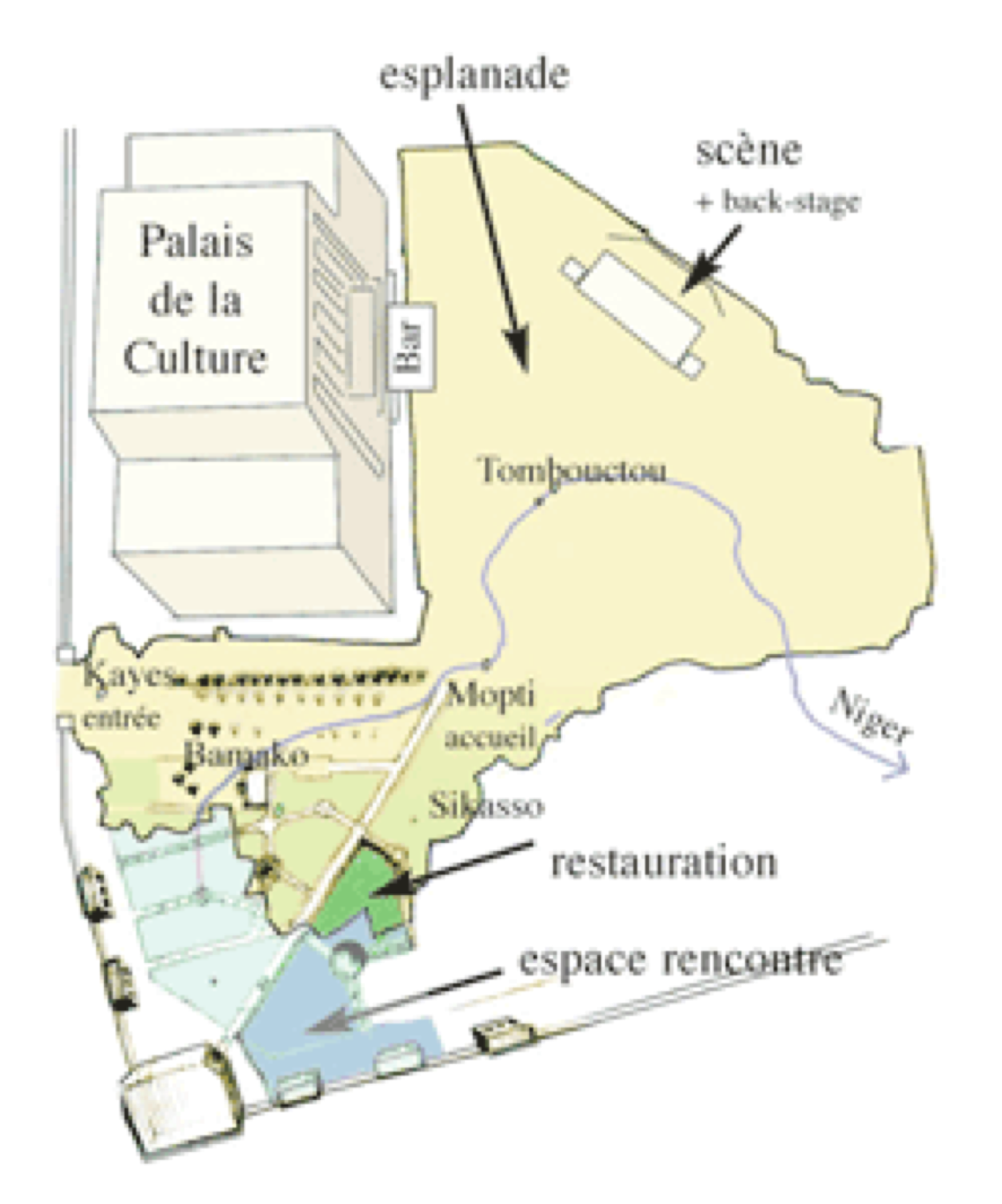 Le plan tracé et les espaces définis, c’est lors de nos divers essais sur la mise en place des différents points d’accueil sur la maquette que s’est révélées l’idée d’exploitation du site en rapport avec le thème du festival.