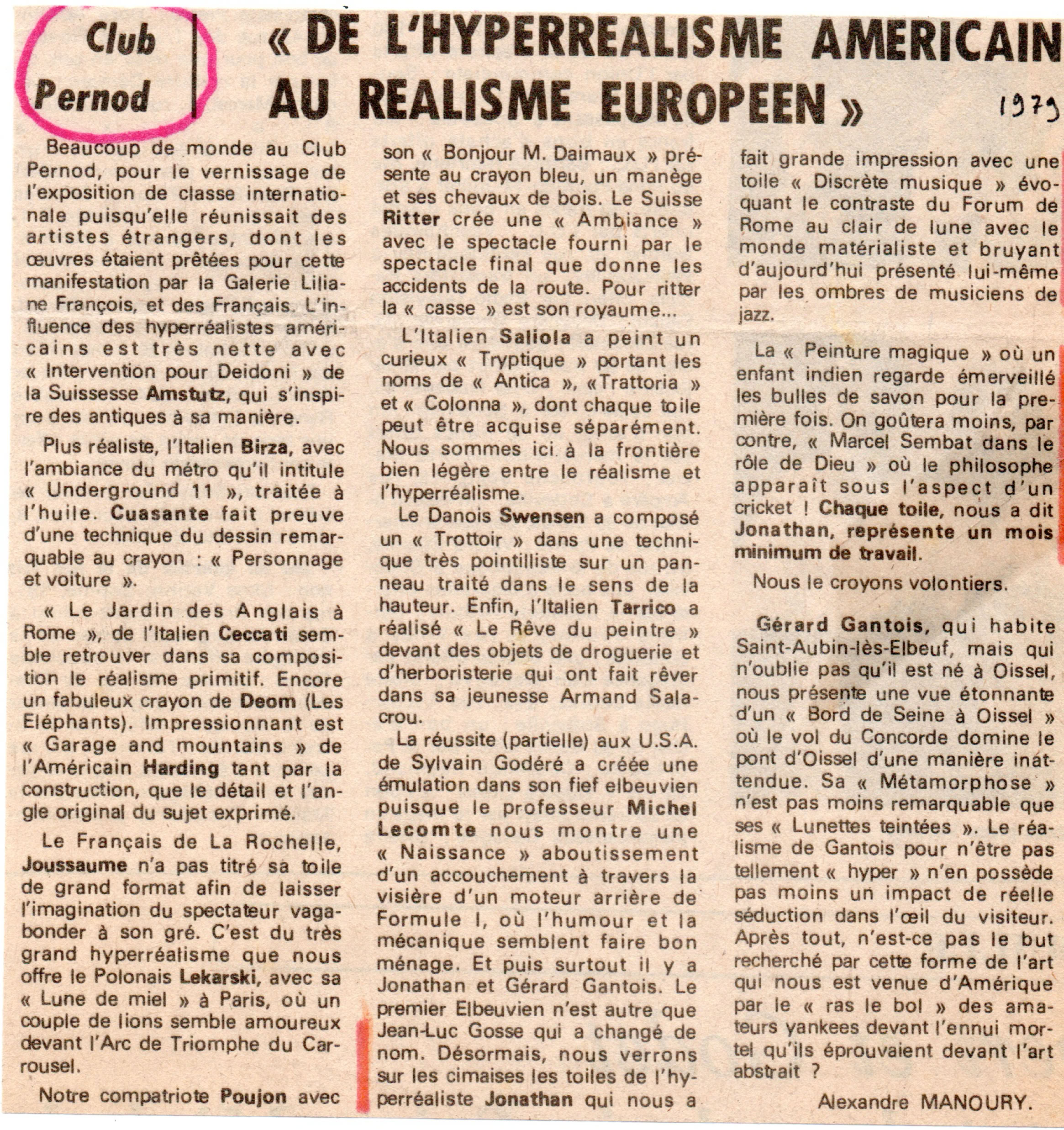 Les salons du Club Pernod offrent leurs cimaises à une quinzaine de peintres, américains, italiens, danois, bulgare, britanique, suisse... et trois français : trois artistes, dont les noms sont bien connus des amateurs d'art contemporain de la région rouennaise, exposent leurs dernières créations à l'occasion de cette exposition.