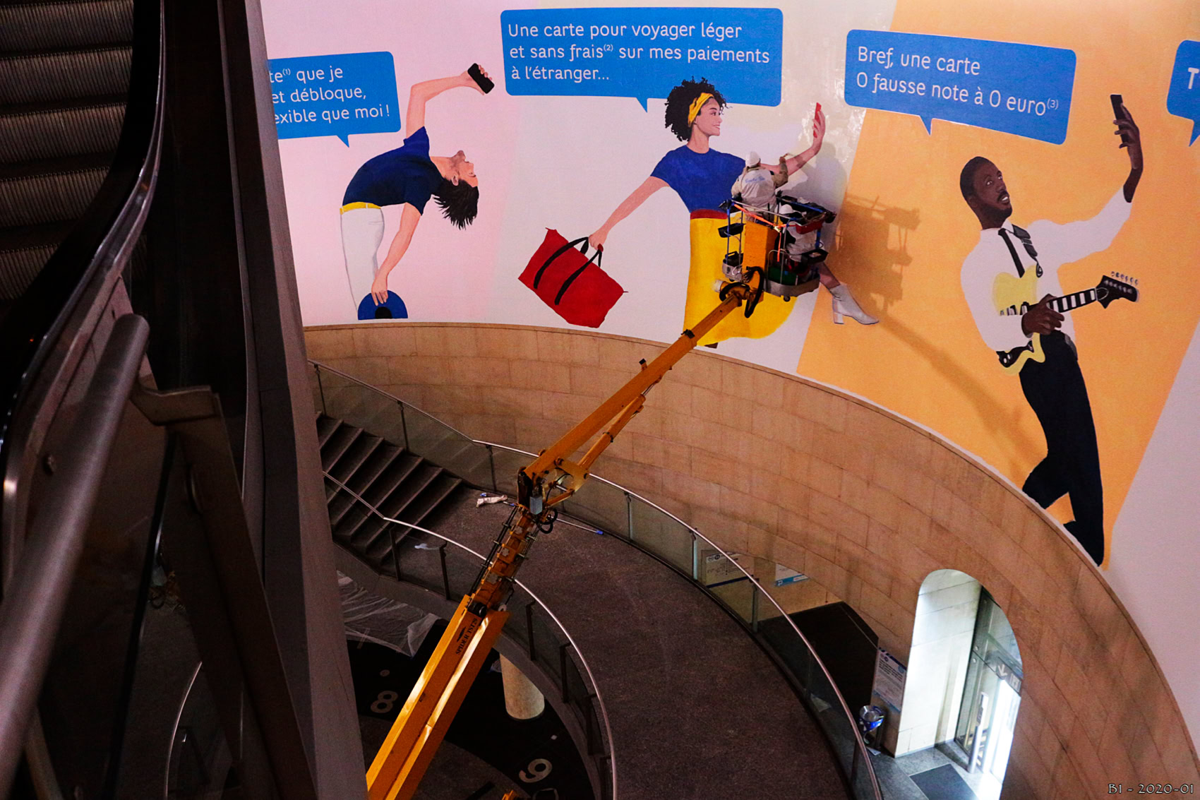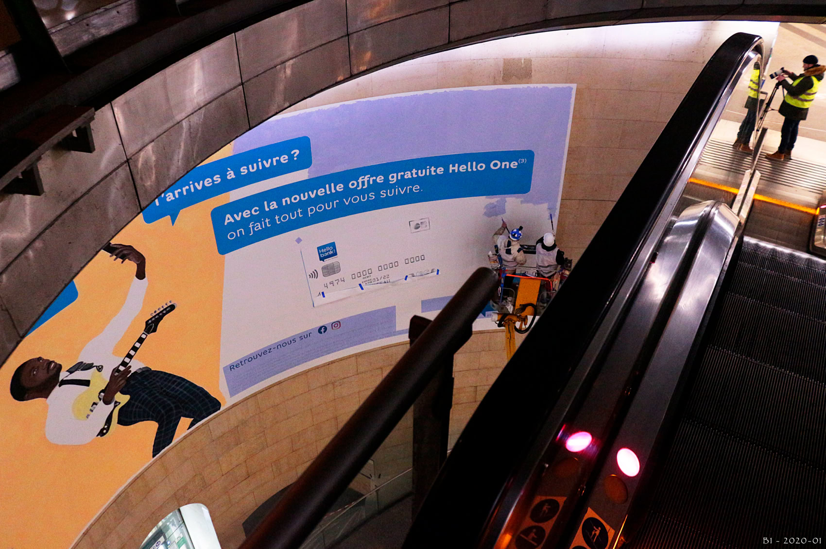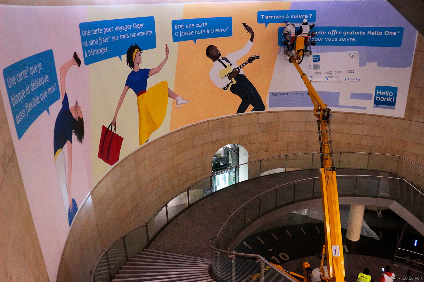 Du 16 au 21 janvier, Hello Bank! investit la Rotonde de la station Saint-Lazare à Paris. En effet, à l’occasion du lancement de sa nouvelle offre, «Hello One», l’annonceur orchestre sa présence dans le métro parisien avec Havas Média, Mediatransports et Publicis Conseil dans un dispositif d’affichage exceptionnel. Elle prend la forme d’une vaste fresque (150 m²) conçue par l’artiste-peintre Goss, spécialisé dans la peinture hyperréaliste. Celle-ci a la particularité d’évoluer quotidiennement. «Chaque bénéfice clé de la nouvelle offre est peint la nuit, durant 5 jours, avant de révéler, la dernière nuit, l’offre et la marque se cachant derrière ce teasing», selon un communiqué. Quotidiennement, à proximité de la fresque, un triptyque d’écrans d’affichage numérique diffusera par ailleurs le reportage de l’avancée créative de la nuit précédente et donne rendez-vous le jour suivant. Dès le 21 janvier, jour de la révélation, et date officielle du lancement de l’offre, le visuel XXL sera accompagné d’une campagne en affichage digital, d’un adhésivage de la mezzanine de la Rotonde à proximité de la fresque, au sein de la station Saint-Lazare, ainsi que par de l'affichage sur les quais du métro parisien et des réseaux de bus en région.
