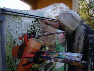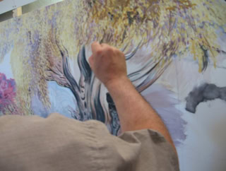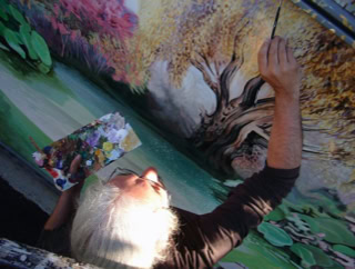 Plus tard, j’ai traité mes peintures murales de grands formats uniquement à l’huile ce qui m’obligeait à ne travailler que sur des projets intérieurs. Puis j’ai étudié la peinture acrylique, je me suis également intéressé aux méthodes utilisées dans l’industrie automobile, ainsi qu’à la technique très raffinée du laque chinois. Je recherchais des supports et des produits adaptés aux conditions difficiles.