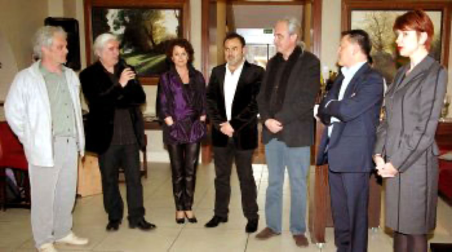 A l'occasion du vernissage de la septième exposition des Artistes d'Atout Cœur présidée par Marie-France Baylet, M. Goss, commissaire général d'exposition, accompagné de M.Christian Delmotte, directeur du Crown Plaza, présente les trois artistes Midi-pyrénéens :